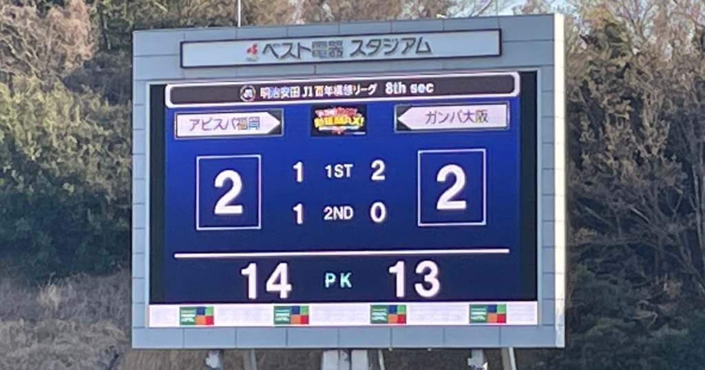 それから長い長いPK戦が始まります。またまたPKを外す三木選手。すごいプレッシャーがかかっているのでしょう。後の選手たちは成功して、ガンバのジェバリ選手のPKを小畑選手が止めてアビスパ福岡の勝利です。
