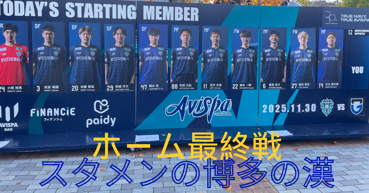 前半は、6分にガンバのゴールがオフサイドで取り消されてからアビスパの方が攻めてチャンスをたくさん作っていましたが得点はなくハーフタイムへ。後半に、前嶋のパスを受けた松岡がゴールを決めてこれが決勝点になりました。監督は、めちゃくちゃ喜んでいました。ホーム最終戦での勝利は、とてもいいものでした。松岡選手の、「博多手一本」は決まっていたし、とても嬉しそうでした。